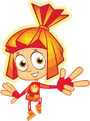 Она носит оранжевый комбинезон с ярко-розовыми и жёлтыми элементами. Комбинезон украшен на груди знаком фиксиков. На руках — розовые митенки, на ногах — коралловые кроссовки с жёлтыми шнурками и серебристой подошвой.