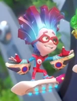 Кроме того, у него есть особые черты: умеет выполнять трюки на фиксиборде, хорошо играет в баскетбол.