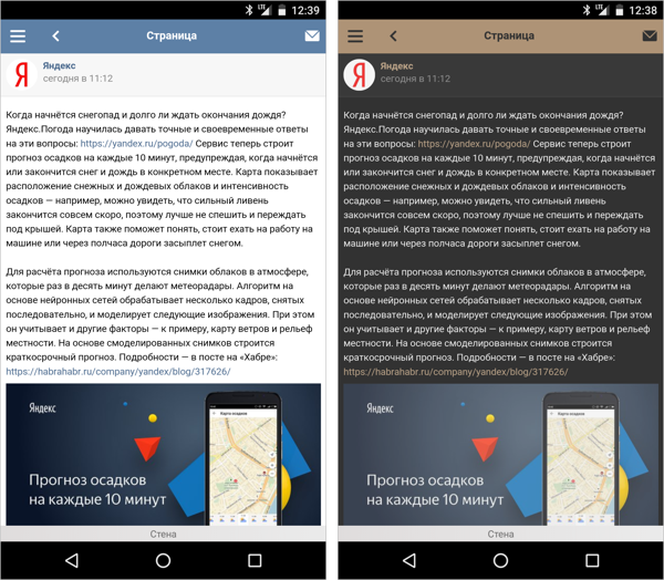 Включив ночной режим, мы не только получим комфортный тёмный фон, но и полностью избавимся от назойливой рекламы на странице.