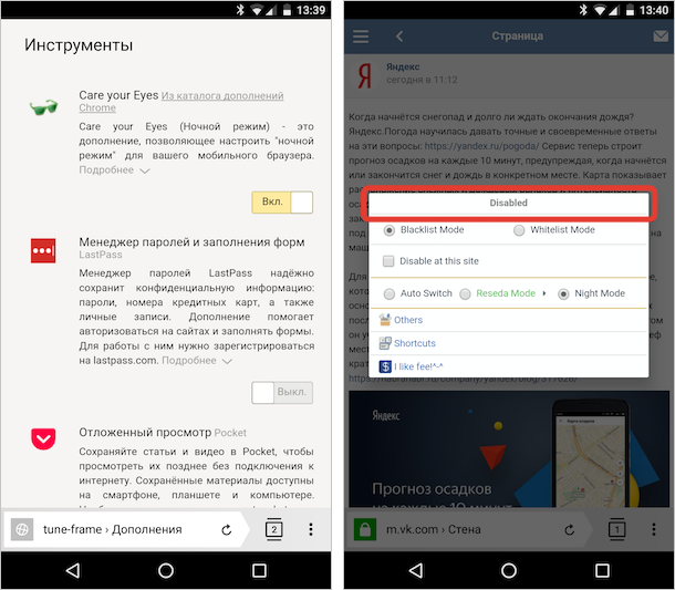 Данное дополнение входит в сборку мобильного Яндекс браузера, но по умолчанию находится в выключенном состоянии.